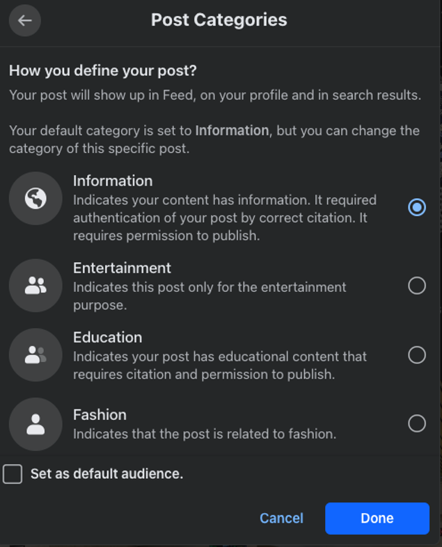 By selecting "Information," the user is indicating that the content they are uploading is meant to provide factual, informative, or educational content, which may include news reports, research findings, data analysis, tutorials, or any other form of content that aims to present factual information.